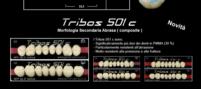 ribos 501 sono denti di qualità e di avanzato sviluppo con struttura PMMA; sono fabbricati con il nuovissimo sistema di compressione "Mega-Press-Inject" per ottenere una densità e una durezza ottimale delle superfici. Il dente viene prodotto in strati e tutte le parti del corpo del dente hanno le stesse caratteristiche tecniche. Questo è fondamentale per la durata della protesi e per la forte resistenza all'aggressione e adesione della placca batterica. La precisione della teconolgia CAD/CAM è subito percebile dal tecnico fin dal primo utilizzo di TRIBOS 501. Per la realizzazione di protesi, secondo il concetto di montaggio NFP, sono disponibili: istruzioni dettagliate per il montaggio dei denti Tribos 501, Tabella Forme, Scala Colori e Cassettiere per un magazzino organizzato. E' possibile ordinare i denti Tribos 501 visitando il nostro sito www.zirconart.it. Il nostro sistema web propone la possibilità, scegliendo gli incisivi superiori o inferiori, di avere automaticamente visibile l'abbinamento con la corrispondente forma di posteriori. In alcuni casi vengono proposti piu' abbinamenti. La consegna dell'ordine verrà effettuata dal nostro Sistema di Distribuzione in tutta la Sardegna. Visualizza la Brochure>>